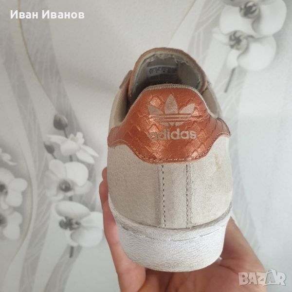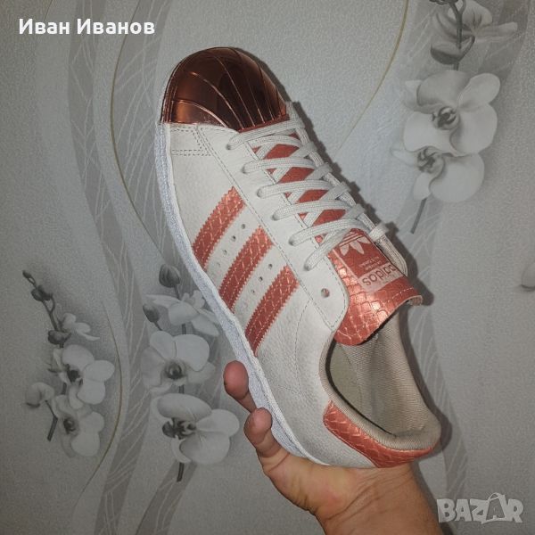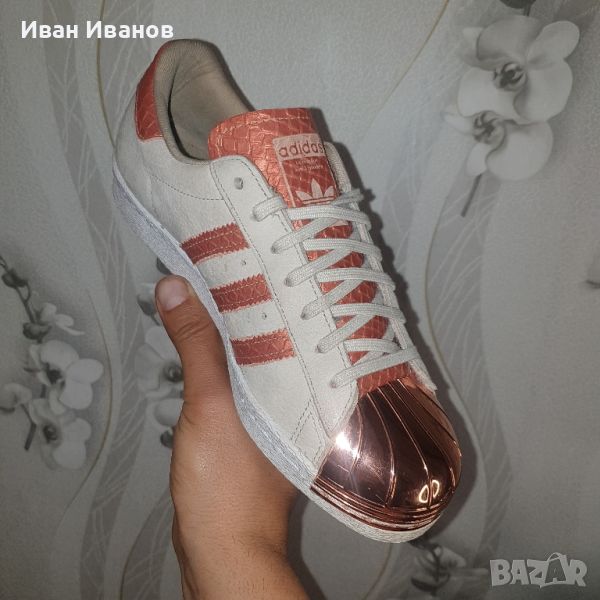 Adidas Superstar 80S Metal ToeНови , само пробвани , Класически модел , много красив , модерен и удобен .Маратонки с които няма да останете незабелязани .Универсалните обувкиAdidas Superstar 80S Metal Toe предлагат комфорт и удоволствие всеки ден. Това са спортни обувки, стилистично препращащи към по-ранни дизайни на Adidas, които са получили нова, динамична форма. Марката се погрижи за атрактивен дизайн и също така осигури най-високо качество на изработка. Горната част е изработена от материала (кожа), благодарение на който краката ни дишат свободно. Подметката, изработена от издръжлива смес, осигурява страхотно омекотяване и много добро сцепление. Задържането на крака, перфектното позициониране и изключителният комфорт са резултат от използването на съвременни решения. Този модел е адаптиран за цялата година. Интересен дизайн, комфорт и безопасност – така накратко може да се опише този модел Adidas.След силния си дебют през 1970 г., обувката adidas Superstar се превърна от баскетболен герой в кралица на уличното облекло. Тази дамска обувка й придава бляскав вид с почти бяла велурена горна част и лъскав крак от истинска метална черупка.Премиум горна част от велурМетална черупка на пръста с лъскаво покритиеПодплата от меко трикоЛуксозни детайлиПрофил с рибена кост и текстурирана гумена подметка