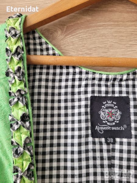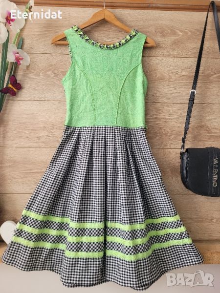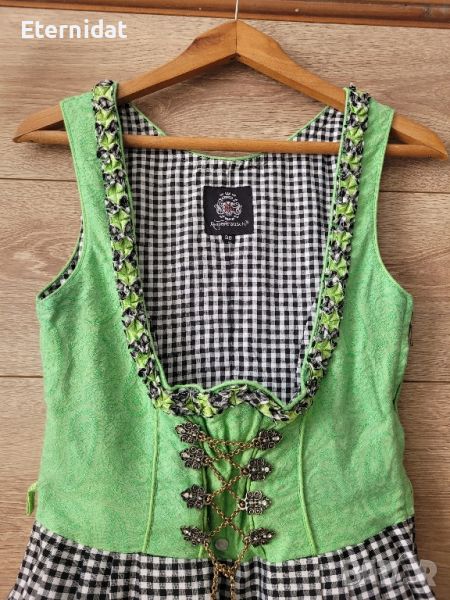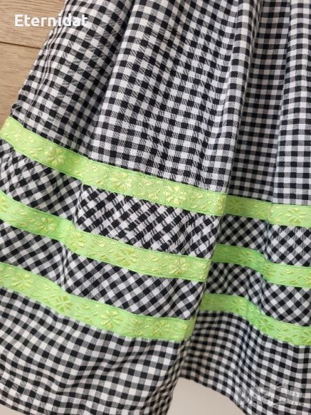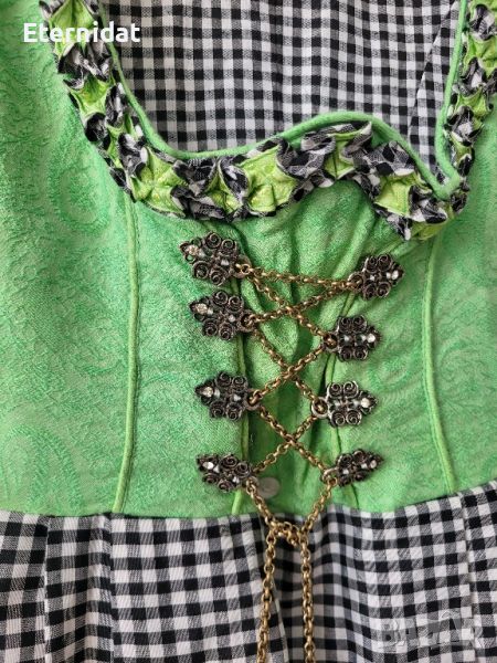 Горна част в зелено с красиви метални орнаменти и верижка за пристягане. Долна част пепид изцяло памучна материя с джобове и шита дантела в зелен цвят.