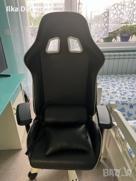 Столът е с размери: 28"D x 28"W x 54"H. Използван три години. Претапициран напълно с много качествена черна еко кожа, която не се напуква и не се лющи. Столът е с ергономична форма и две възглавници за кръста и врата.