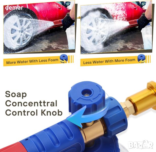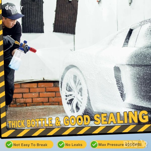 Този дозатор за снежна пяна разполага с бърз конектор с месингова сърцевина за подобрено уплътняване и е съвместим с повечето машини за миене под налягане Karcher (с изключение на серията HD). Може да се похвали с максимално налягане от 4000 PSI и голям капацитет от 1 литър, идеален за измиване на цели превозни средства. Регулируемата дюза предлага ъгъл на пръскане 0-60°, което позволява контрол върху размера и посоката на ветрилообразната пяна, вертикално или хоризонтално. Горният бутон регулира съотношението пяна към вода за гъста или рядка смес от пяна. Устройството се монтира лесно, напълва се със сапун и топла вода, прикрепя се към пистолета за миене под налягане и се регулира за желаното ниво на пяна. Неговият широк отвор и прозрачен дизайн правят добавянето на сапун и наблюдението на нивата лесно. Ергономичната, нехлъзгаща се бутилка с пяна подобрява комфорта на потребителя, което я прави подходяща за различни задачи за почистване, включително мотоциклети, автомобили, покриви и др.