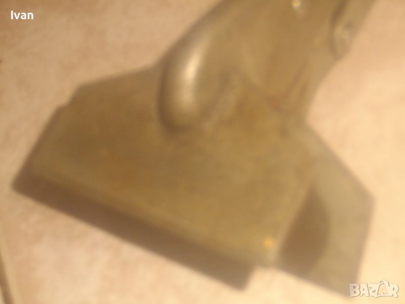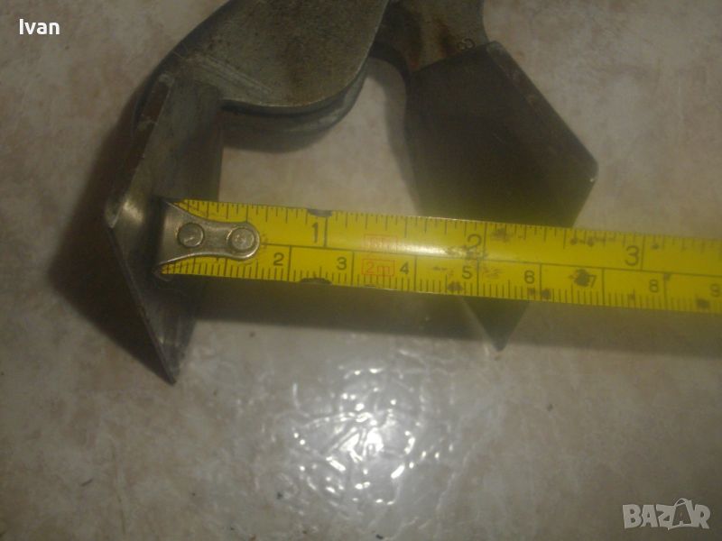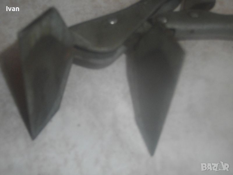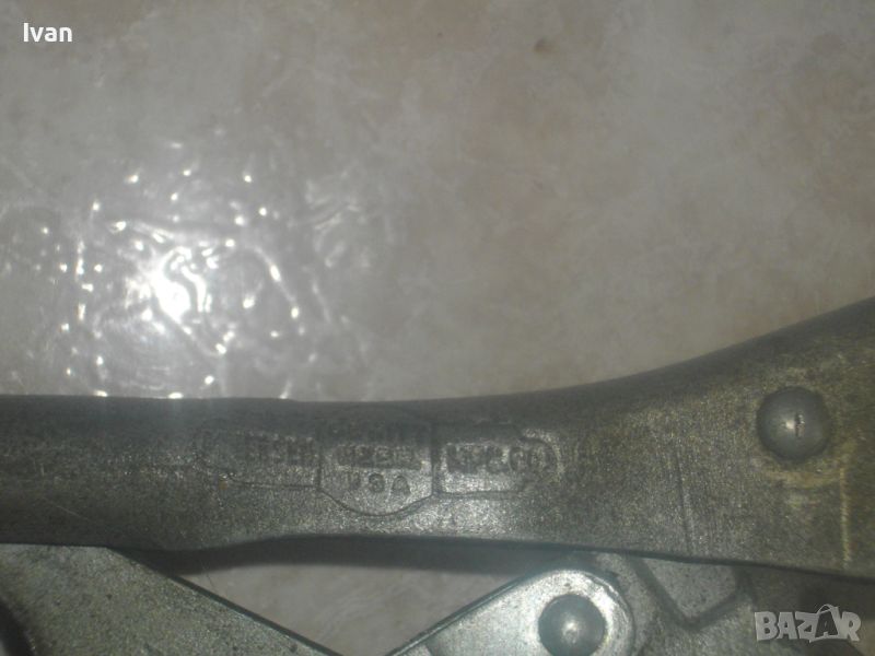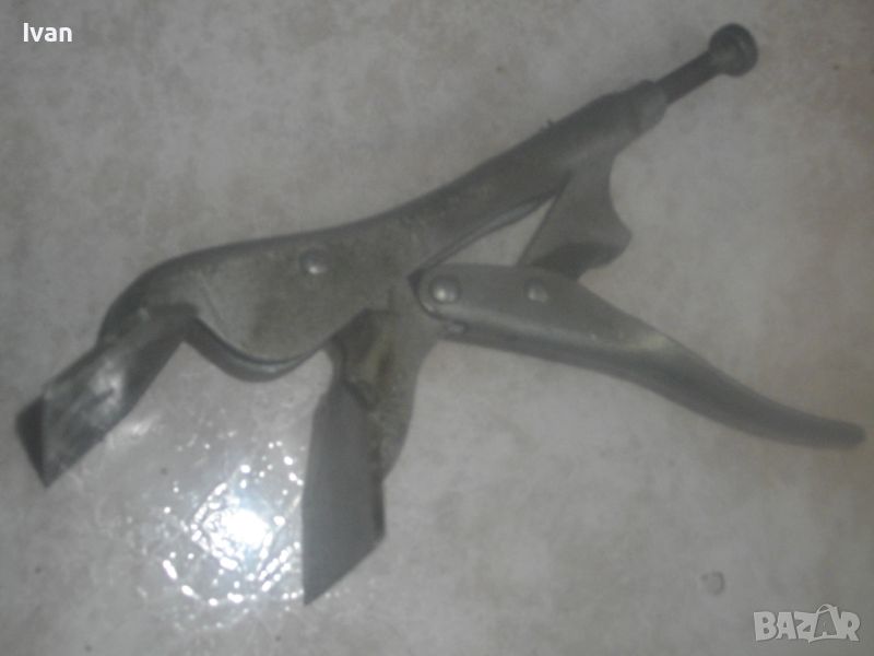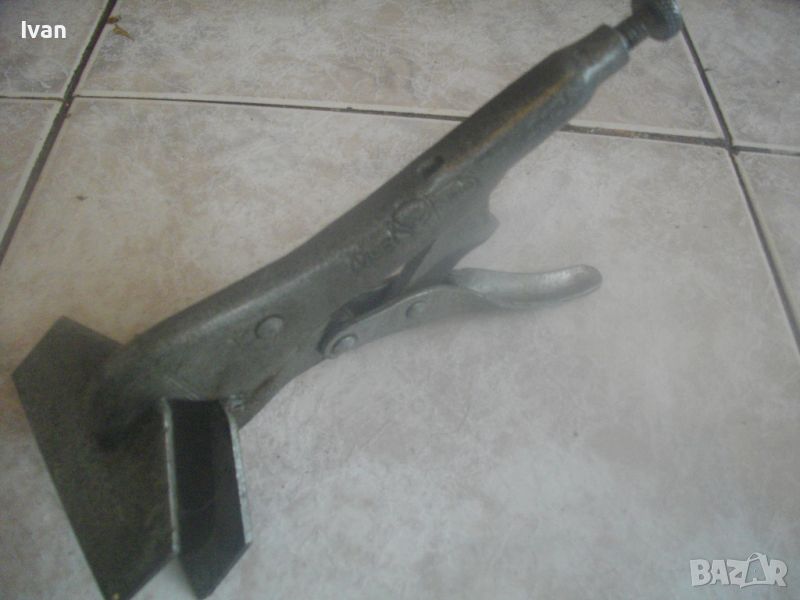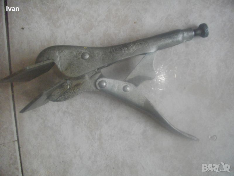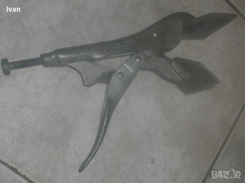 ОПИСАНИЕ на грип клещи трета ръка чирак тип тенекеджийски - старо качество - алуминиеви изцяло с големи широки плоски носове - VASE GRIP №8 - САЩ - регулируеми, със заключване - цена 99 лв. Прдназначение в тенекеджийството при заваряване като помощен инструмент. Маркировки по тях - от двете страни - VISE GRIP US - №8 - маркировки по плоските челюсти - Pattent Aplied For. Старо качество американски оригинален инструмент. Дължина 200 мм, винтов отварящ се механизъм на плоските челюсти за захват - захват до 60 мм отваряне. Размери на плоските челюсти - 80х40 мм. Материал на инструмента - изцло алуминиеви, реглажният винтов болт също алуминий. Тегло на клещите - 0,8 кг. Цена 99 лв.