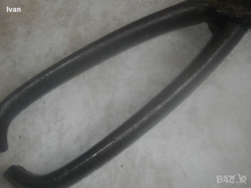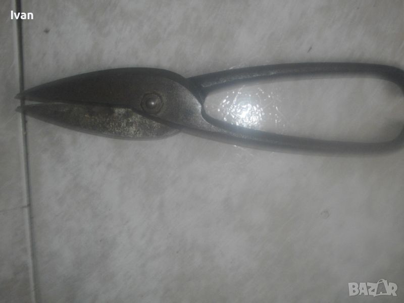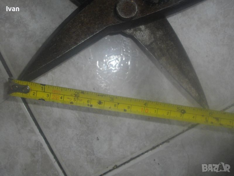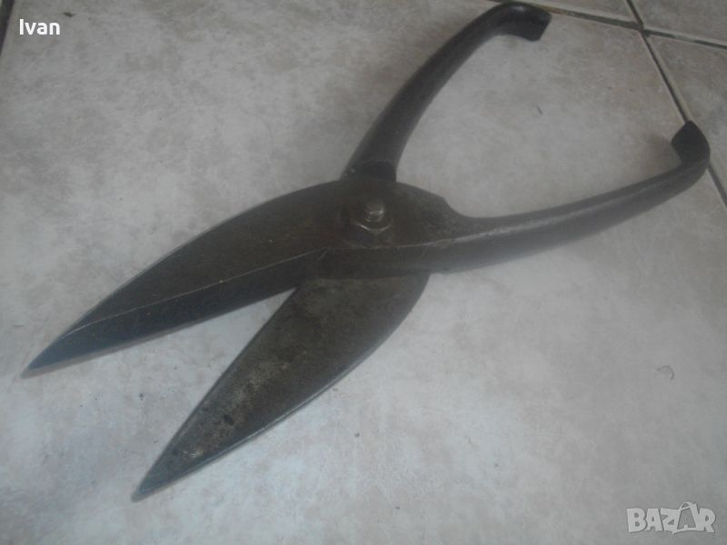 ОПИСАНИЕ на голяма 300 мм ножица за рязане на ламарина - цена 59 лв. Като нови, отлично визуално и работно състояние. Дължина 300 мм. Без никакви наранявания по остриетата. Старо немско качество. Масивни. Маркировка D.Остриета - 90 мм. Ножицата е изцяло от плътно дебело желязо. Тегло 1,5 кг. Цена 59 лв.
