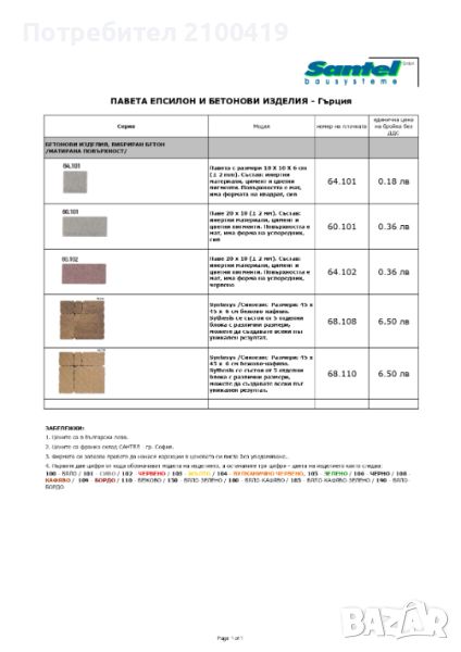 1. Павета с размери 10 Χ 10 Χ 6 cm (± 2 mm). Състав: инертни материали, цимент и цветни пигменти. Повърхността е мат, има формата на квадрат, сив - 0,18лв/брой без ДДС