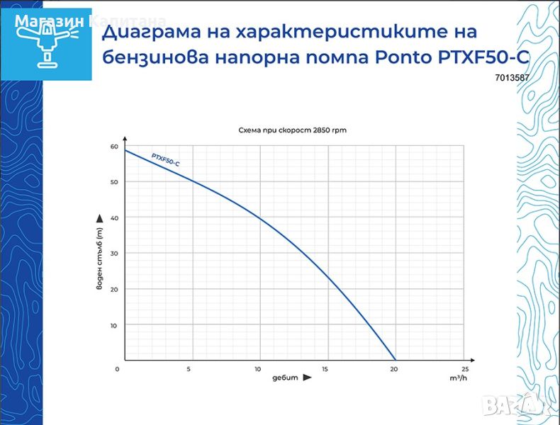 Бензинова напорна водна помпа е с мощност 7 к.с, напор 70 м и дебит 20 м³/ч. Дълбочината на засмукване на помпа е 6 м. Има въздушен филтър с неръждаема стомана, стоманен разпределителен вал и уплътнител на маслото от флуорна гума. Помпата намира приложение в селското стопанство, градинарството и при различни напоителни дейности.