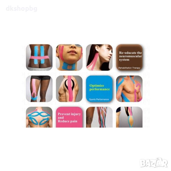Кинезио лентата може да се използва за лечение на всички видове мускулни болки и леки наранявания, болки в коленете, гърба, раменете. Можете да срежете лентата в желани от вас размер и форма.