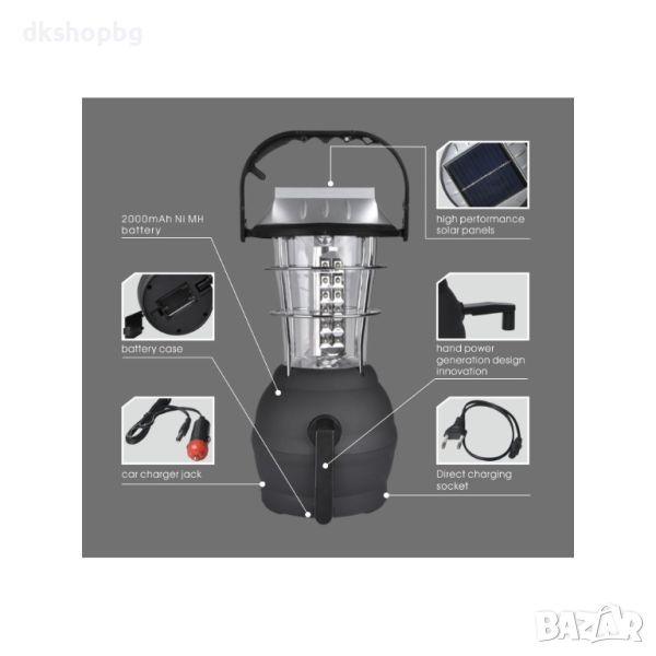 - Екологично и енергоспестяващо мобилно къмпинг осветление с динамо и солар. 2 мин. навъртане на динамо-дръжката осигурява 25 минути светене.