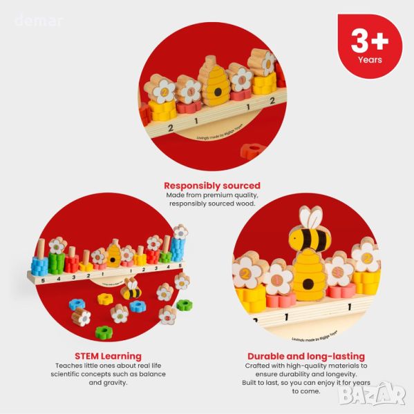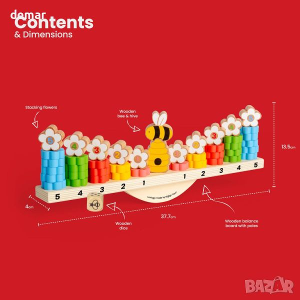 Играта Bee Balanced е детска играчка 2 в 1, която съчетава настолна игра за баланс с 44 части, включително подреждане на цветя, пчела, кошер и зарове, предназначена да учи на стратегия, логическо мислене и баланс. Идеална за STEM обучение, тази игра подпомага ранното детско развитие чрез въвеждане на научни концепции. Подходящо за деца на 3 и повече години, то е перфектен подарък за рожден ден или Коледа и е лесно за транспортиране с включена чанта за съхранение с шнур. Изработена от FSC сертифицирана дървесина с устойчив произход и в съответствие със стандартите за безопасност на играчките EN71, използва нетоксични бои и лакове, гарантиращи безопасност и устойчивост.