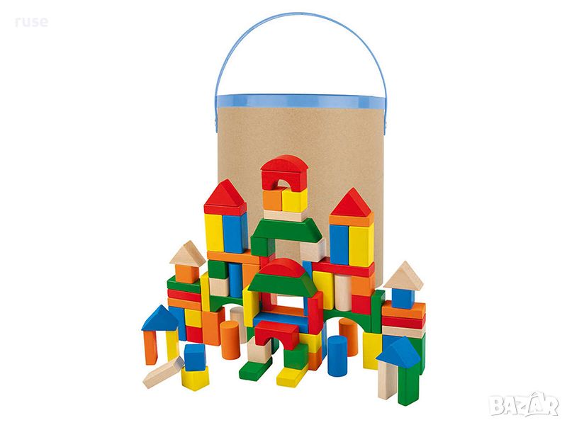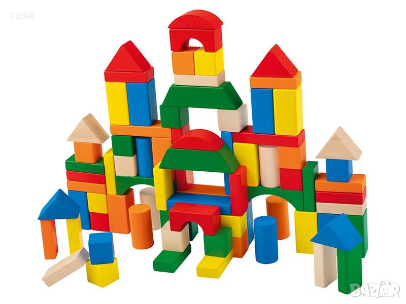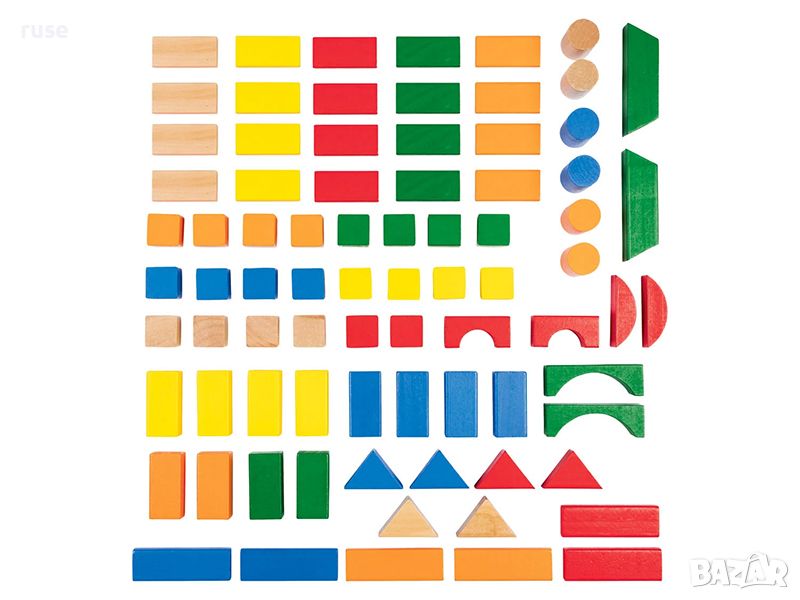 - Строителни блокове от естествено масивно дърво с цветни шарки в различни форми