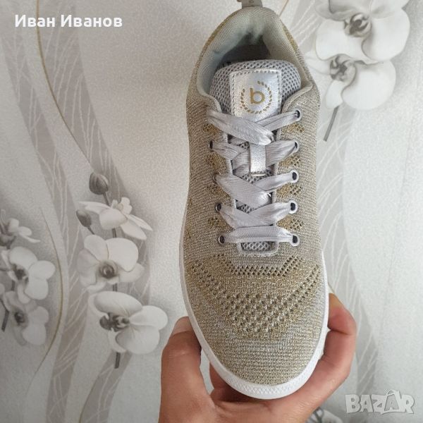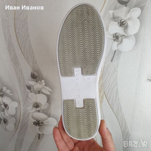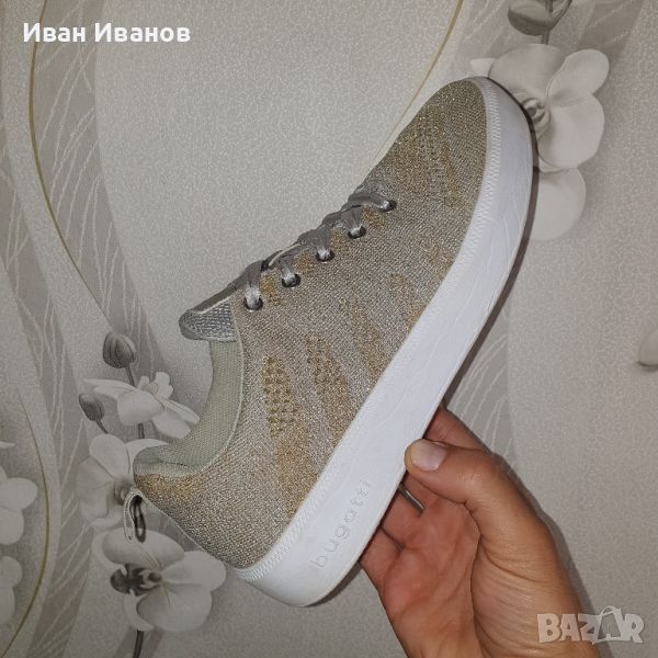 спортни бежово- златисти обувки BugattiМалко използвани , без следи и забележки . Обувки от колекция Bugatti. Моделът е направен от текстилен материал.- Заоблен, гумен преден участък на обувката.- Неплъзгаща се, стабилна външна подметка.- Подсилена част при петата.- Модел с връзки.- Дължина на стелката: 25,5 cm.- Мерките се отнасят за размер: 40Състав:Горна част: Текстилен материал