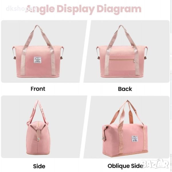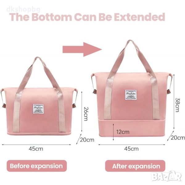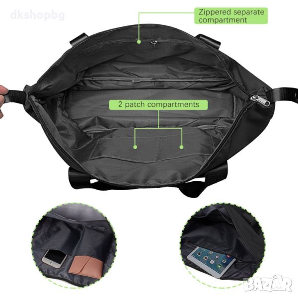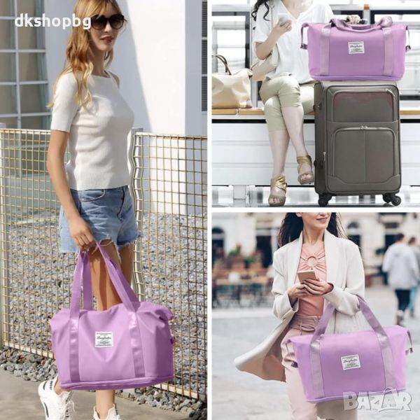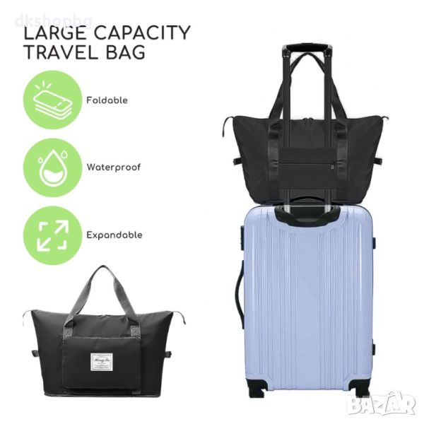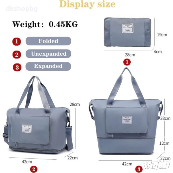 Сгъваема пътна чанта с голям капацитет. Можете да я носите в ръка, да я носите през рамо или дори да я прикрепите към куфар на колела, когато пътувате. Перфектна чанта за всяко пътуване. ГОЛЯМ КАПАЦИТЕТ - Благодарение на големия капацитет и много джобове, ще сте подготвени за всяко пътуване и нещата ви винаги ще бъдат в идеален ред. В чантата си можете лесно да разделите дрехите си на сухи и мокри части. Не е нужно да се притеснявате, че потни дрехи или мокри кърпи ще влязат в контакт с чисти дрехи. Перфектен за туризъм в планината, уикенд екскурзии до плажа или ежедневни тренировки.