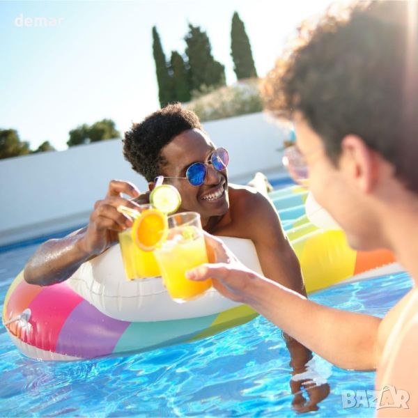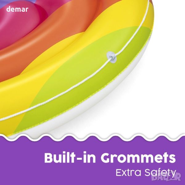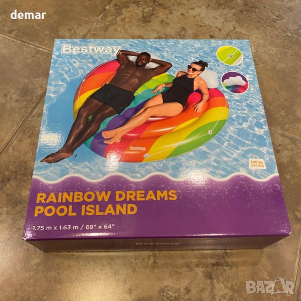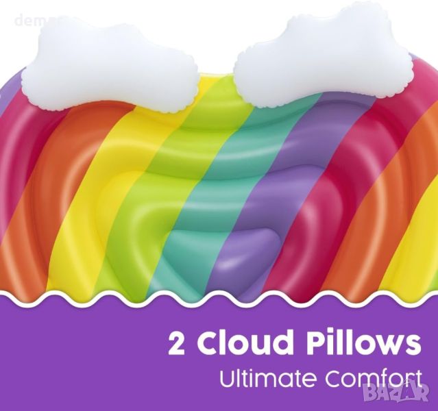 Bestway Rainbow Dreams Pool Island е вашият идеален летен аксесоар, който побира двама възрастни с луксозни възглавници във формата на облак за максимален релакс и подкрепа. Тази плувка ви позволява да се носите и да се излежавате удобно под слънцето, подобрявайки вашето изживяване в басейна със своя визуално привлекателен и ергономичен дизайн. Включва предпазно въже за захващане с вградени втулки за лесен достъп и сигурно боравене. Настройването и съхранението на тази плувка е лесно, благодарение на функцията за бързо издуване, което гарантира, че е готова за употреба всяко лято без никакви проблеми. Издръжлив и безопасен, той е идеален за създаване на незабравими моменти във водата с приятели и семейство.