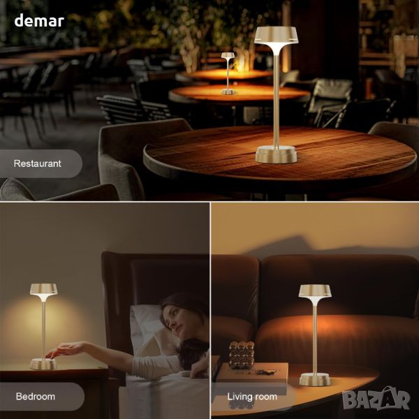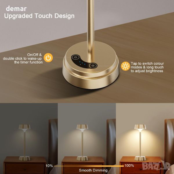 Тази първокласна безжична сензорна лампа се отличава със стилен алуминиев корпус със сатенирана повърхност, съчетаваща елегантност с практичност. Захранва се с батерии, което ви освобождава от неприятностите по окабеляване и е оборудвано с качествени LED перли, които предлагат три цветови режима (2700K, 3500K, 4500K) и възможности за плавно затъмняване от 5% до 100%, което ви позволява да персонализирате осветлението си, за да създайте комфортна среда. Системата за сензорно управление включва 60-минутен таймер за автоматично изключване, което подобрява удобството и енергийната ефективност. Акумулаторната батерия на лампата от 5200 mAh осигурява от 8 до 50 часа употреба в зависимост от настройката на яркостта и разполага с LED индикатори за наблюдение на живота на батерията. Освен това, неговата неплъзгаща се EVA основа осигурява стабилност дори при накланяне до 30°, което го прави универсален избор за спални, всекидневни, ресторанти и др.