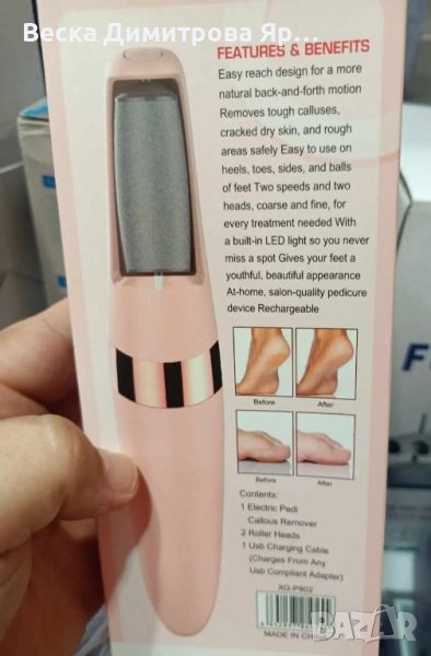 Грижата за петите и ходилата е важна, тъй като тя осигурява здрава кожа и комфорт. Пилата се захранва с литиево йонна батерия, която се зарежда с USB кабел включен в комплекта.