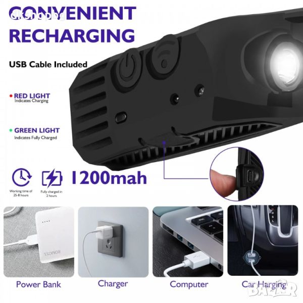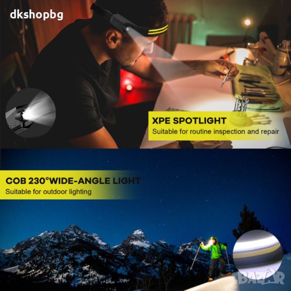 ✅ Допълнително челникът е оборудван с възможност за включване на сензор за движение (чрез бутон на корпуса), който включва и изключва фенерчето с жест на ръката. Тази опция ще бъде особено полезна, например когато работите върху кола или други машини. Тя ще ви позволи да включвате/изключвате източника на светлина, без да докосвате челникът с мръсни ръце.