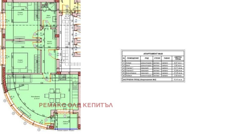 Площта на апартамента е 77 кв.м, а изложението е запад-юг. Жилището се състои от: входно антре, две спални, просторна всекидневна с кухненски бокс, баня с тоалетна, тераса и килер. Към апартамента може да бъде закупен и гараж или паркомясто. Сградата ще разполага с фотоволтаична електрическа централа и две станции за зареждане на електрически автомобили.