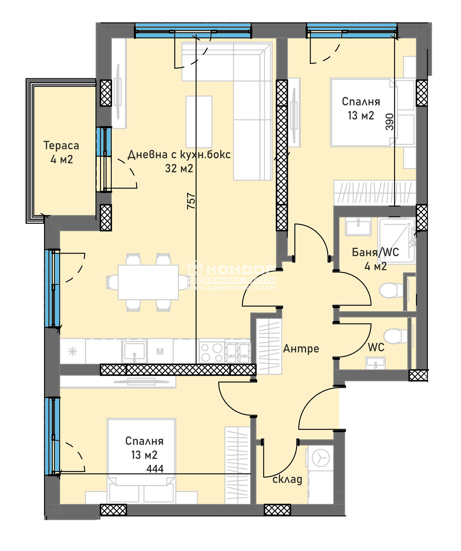 Оферта 64442: Предлагаме Ви възможността да закупите 3 - стаен апартамент в новоизграден луксозен жилищен комплекс с модерна визия, проектиран да създаде максимален комфорт на живущите в него. Функционално разположени жилищни секции с елегантен силует готов да предложи комфорт и модерен начин на живот. Едно от основните му предимства е страхотната локация, отлична комуникативност и динамична пътна инфраструктура, която осигурява бърз и лесен достъп до комплекса от всяка точка на града. Той съчетава лукс, спокойствие и комфорт с подсигурени паркоместа и гаражи. Жилището се състои от просторна ъглова дневна/32 кв.м./ с кухненска част и трапезария, две самостоятелни спални по 13кв.м., баня с тоалетна, втора тоалетна, входно антре, перално помещение и една тераса. Към апартамента има избено помещение, включено в цената! Основната концепция при проектирането е да се постигнат просторни и функционални стаи, с цел да се създаде максимален уют на модерното семейство. Изключителна съвременна архитектура и модерна технология на строителство. Визията е иновативна, привличаща внимание с уникалността си. Всяко жилище разполага с пълно окабеляване за домофон, интернет и кабелна телевизия, общите части са луксозно завършени, жилищата са с алуминиева дограма с троен стъклопакет от най-висок клас, масивна блиндирана входна врата. За удобство на живущите съществува възможността да закупят подземни паркоместа и гаражи с топла връзка към комплекса. Гъвкави схеми на разсрочено плащане спрямо възможностите на клиента в рамките на строителството или закупуване чрез Банков Кредит, на изключително изгодни условия за клиенти на агенцията !!!