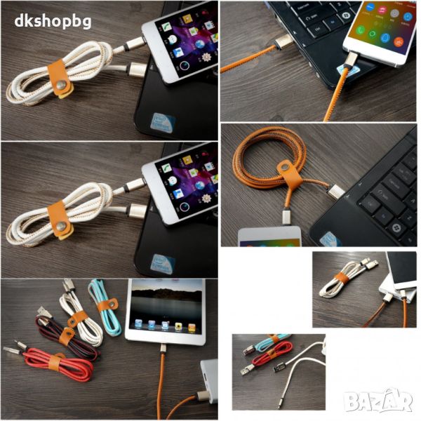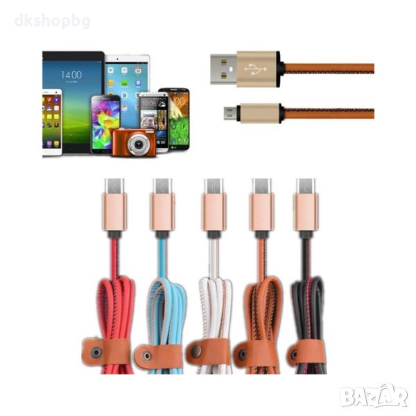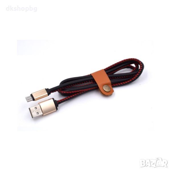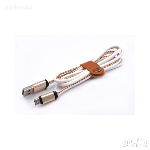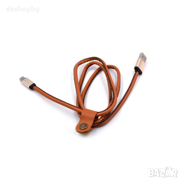 Луксозен кабел за бързо зареждане на мобилни устройства с кожено покритие и декоративен шев.