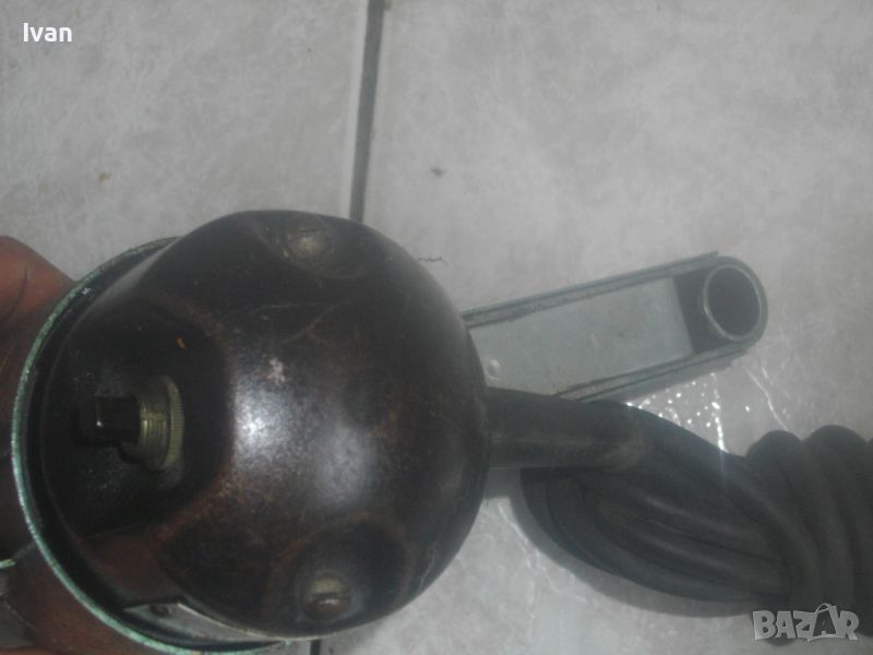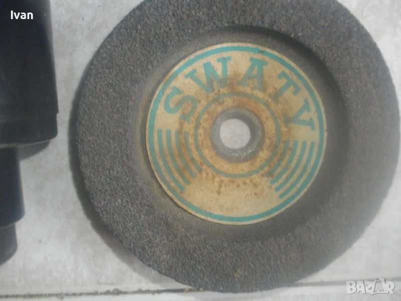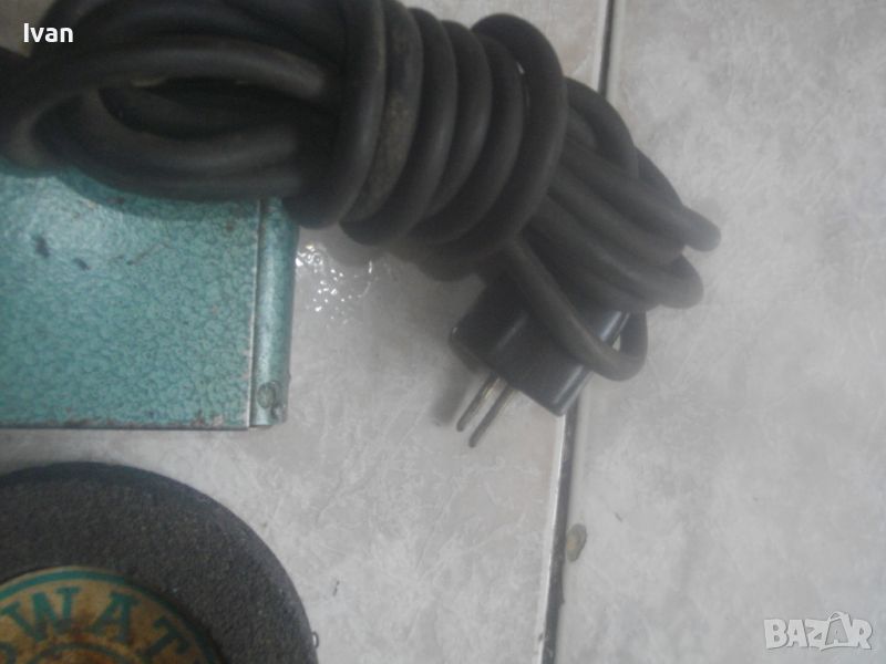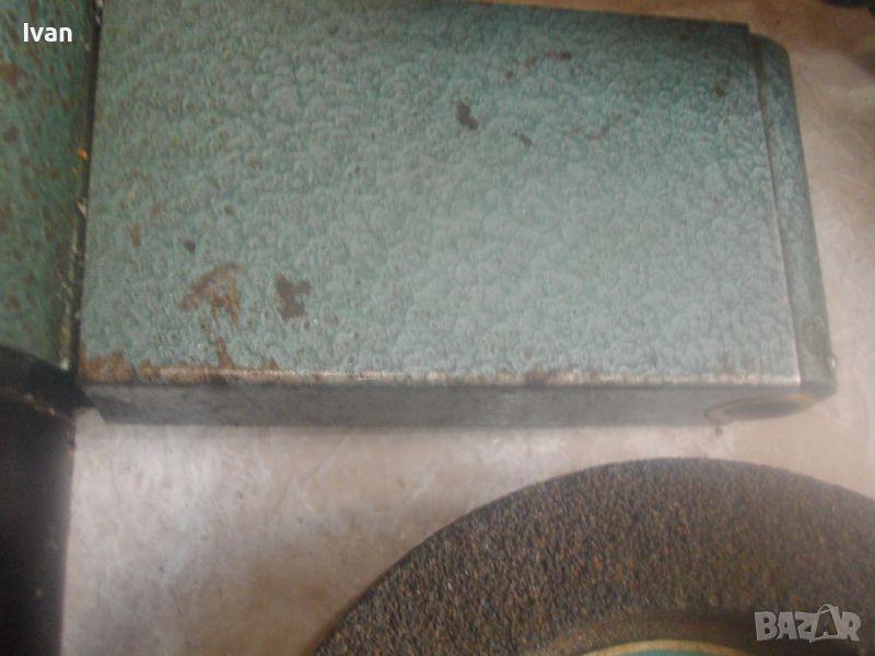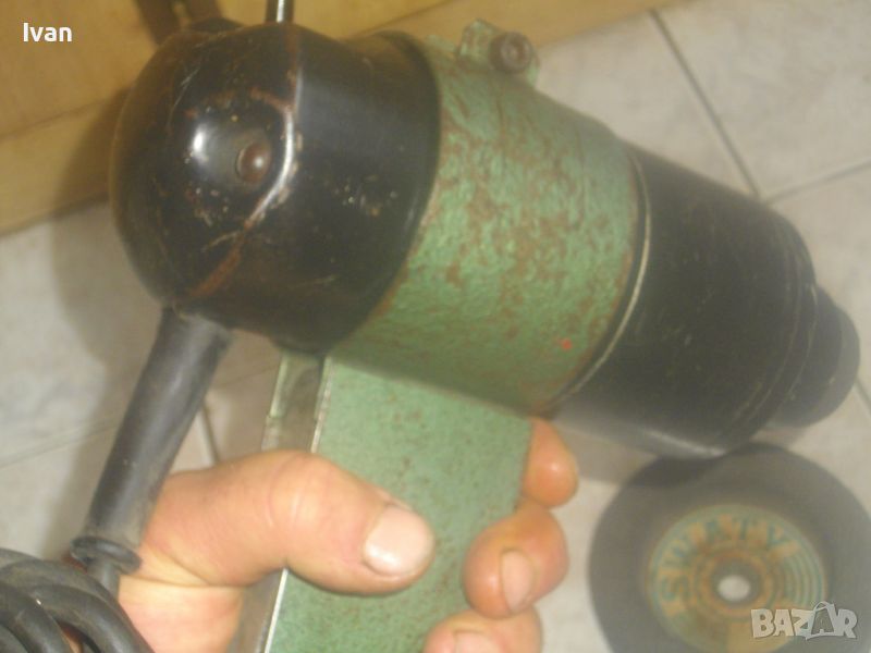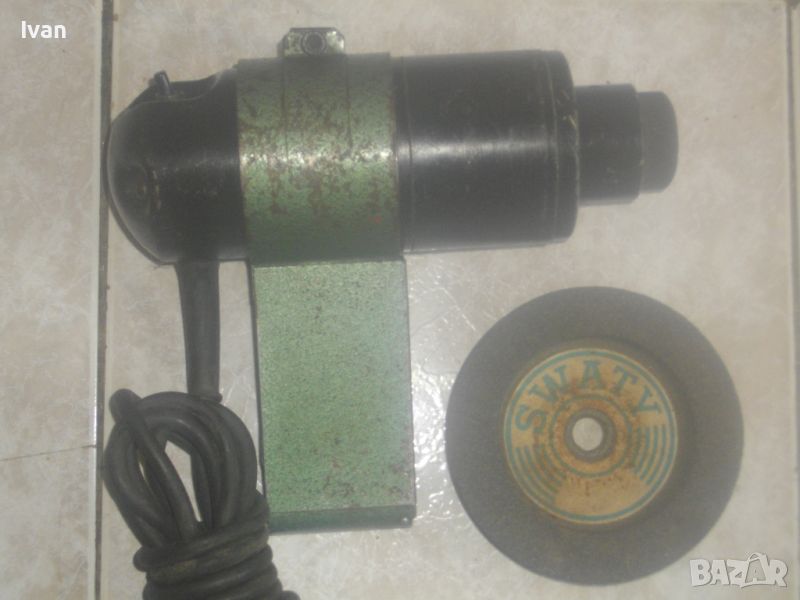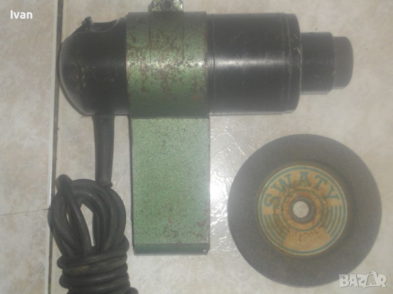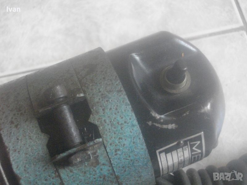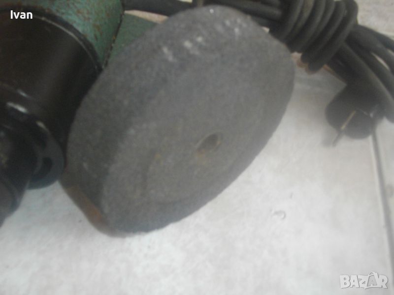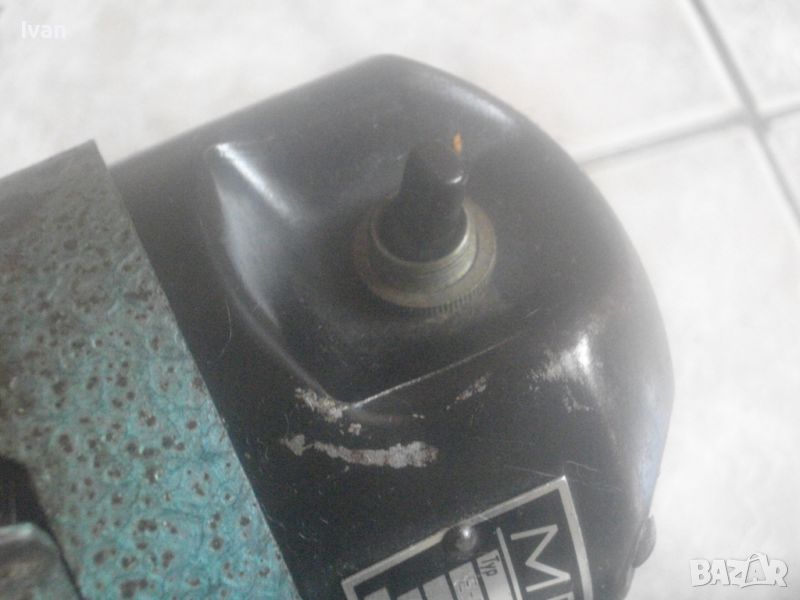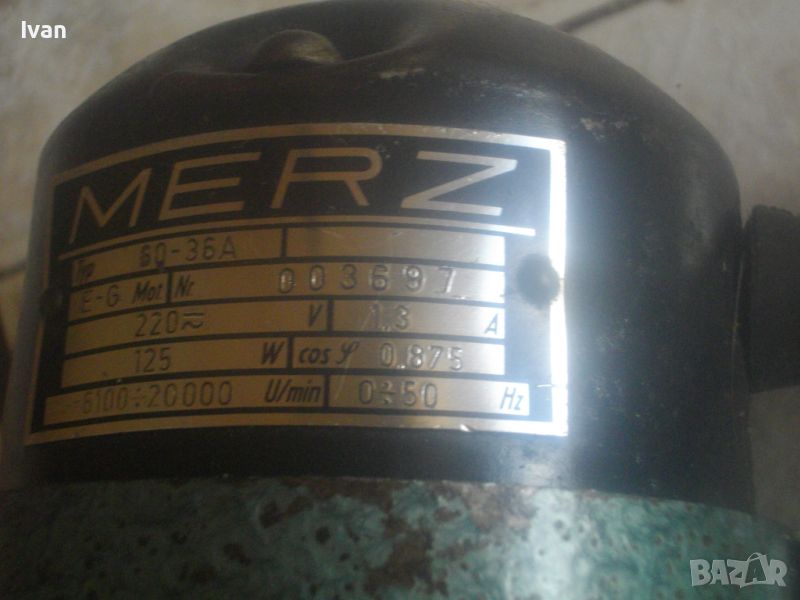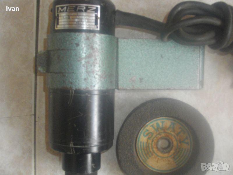 ОПИСАНИЕ на ел. роторен шмиргел индустриален/професионален/промишлен 125 вата. Немски професионален, масивен. Марка и модел -MERZ Typ 50-38 Aл Почти нов, с много запазен външен вид и отлично работно състояние. Без забележки. Характеристики - 125 W - Losy - 0,875 , 0-50 Hz, 6100-20 000 об/мин. Машината от старото масивно качествено немско качество. с налични 2 броя различни шлифовъчни камъни дискове /също старо качество/, които са като нови. Метален стоманен изцяло корпус на машината с бакелитов пусков ключ, гумиран оригинален захранващ кабел, с оригинален щепсел ASE. Метална регулируема стоманена широка и удобна предна дръжка. Поставен малък шлифовъчн камък тип чашка за шлайфане в труднодостъпни места ф 43 мм, почти нов. Дължина на машината напред - 120 мм, дължина надолу със задна дръжка - 200 мм, диаметър на машината - ф80. Втори шлифовъчен камък диск към машината - нов, 0,8 кг/ф 125 мм/тип чашка/дебелина 30 мм. Марка на камъка SWATY. И двата камъка са старо качество. Тегло на шмиргела с малкия поставен диск камък - 3,2 кг. Тегло заедно с големия камък - 4,0 кг.