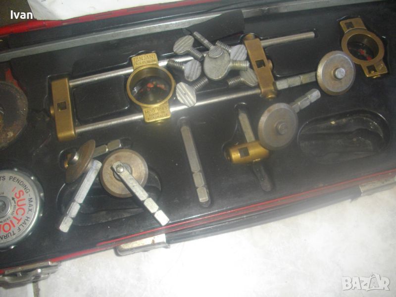 ОПИСАНИЕ на комплект в червен метален куфар аксесоари и прибори за кислородно плазмено рязане газово. Оригинален австралийски комплект, маркиран. Метален кухар размери 425х180х50мм. Маркировки/марка/производство/производител/надписи - TANIGOT - Guides For Plasma or Oxy Fuel Gaz Zorches - Made in Australia. Стикер Hatek Budetf Lastechniek - Postbus AGDELFT. Кутията е масивна, с метални копчалки и гумена издърпваща се дръжка. Вътре е с дунапрен и ПВЦ вложки. Вътре надписи - CP 1002 Plasma Guide Kit Suits Hypertherm Max 20-40-42. Made by TANJANT Tool - Made in Australia. За заинтересованите - като се изпише в нета CP 1002 Plasma Guide Kit и излизат различни линкове с комплекта от обявата с обяснения и техн.характерестики за него. Цената му в различни сайтове е средно 330 долара. В комплектът има оригинална книжка на английски с нагледни скици и рисунки с обяснения за употребата на комплекта. Маркировка на компонентите - TANJANT Pats Pending и серийни номера. На снимките се виждат всички компоненти на комплекта. Около 15 части и 10-20 различни по големина болтови врътки пробки алуминиеви. Тегло на комплекта с кутията - 3,0 кг.