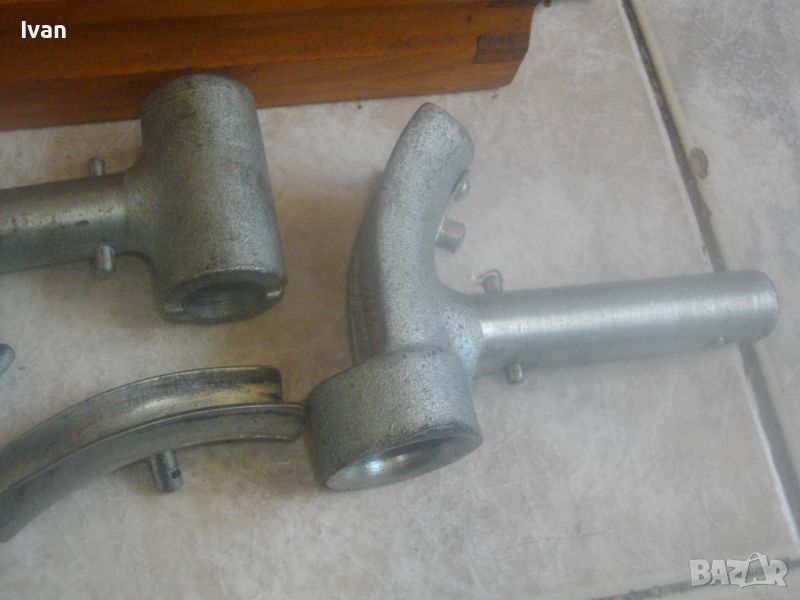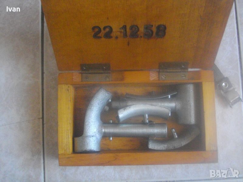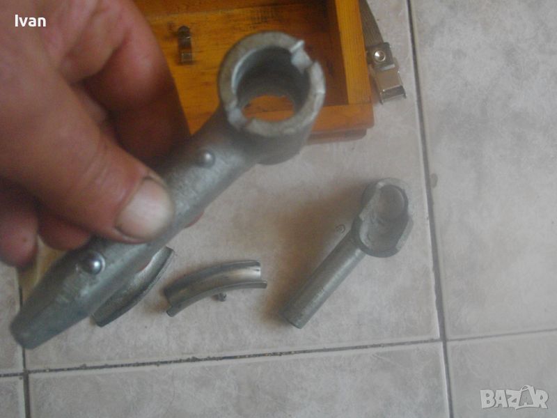 ОПИСАНИЕ на уред за раздуване на тръби - раздухвач на тръби в дървена кутия - цена 299 лв. Немски професионален от стария материал. Старо качество. Раздухване на тръби диаметър от ф 16 мм до ф 22 мм. Марка - EWZ. Почти нов, пълен комплект, в отлично визуално, работно и механично състояние. Размери на кутията - 205х120х65мм., пристягане чрез оригинална платова лента вързалка с метална закопчалка.Включва 5 части метални плюс кутията. Всчки части са стоманени. Раздухвач, стойка към раздухваза за различен размер полукръг за раздухване. 3 разли„ни по раземр полукръга, който се поставят на раздухвача - размери 16мм, 20 мм, 22 мм. Тегло на комплекта - 1,5 кг. Цена - 299 лв.