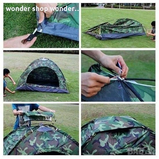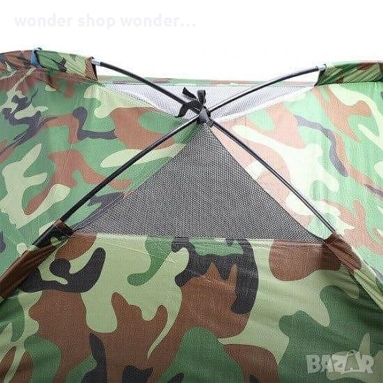 Камуфлажна четириместна палатка, идеална за къмпинг, излет, почивка на планина или море.
