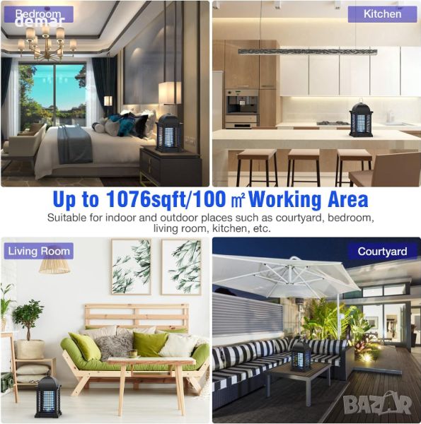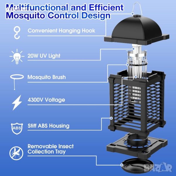 Лампата за унищожаване на комари TMACTIME предлага ефективен и екологичен подход за контрол на насекомите, като използва мощна 20W и 4300V електрическа мрежа. Той излъчва ултравиолетови светлинни вълни при 365 нанометра, като ефективно привлича и бързо убива широка гама от насекоми, включително комари, плодови мушици и молци. За оптимална работа е препоръчително да използвате лампата на тъмно и да я включвате 2-3 часа преди лягане. Това устройство използва физически методи за елиминиране на насекоми, което го прави нетоксичен и без замърсяване, следователно по-безопасен и по-екологичен от химическите спрейове. Отличава се с повишена безопасност дизайн с мрежест корпус от ABS пластмаса за предотвратяване на случаен контакт, което го прави безопасно около деца и домашни любимци. Устройството включва 47" PVC захранващ кабел и удобен пръстен за окачване за лесно поставяне. Лесният за почистване дизайн включва подвижно квадратно шаси, което опростява задачата за изхвърляне на мъртви насекоми - просто го завъртете, издърпайте пръстена, изчеткайте , и изплакване, подходяща както за вътрешна, така и за външна среда, тази тиха и незамърсена лампа е идеална за домове, както и за външни пространства като задни дворове и къмпинги, като се гордее с водоустойчива конструкция, която издържа на природните стихии.
