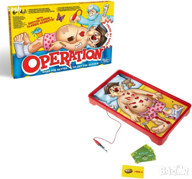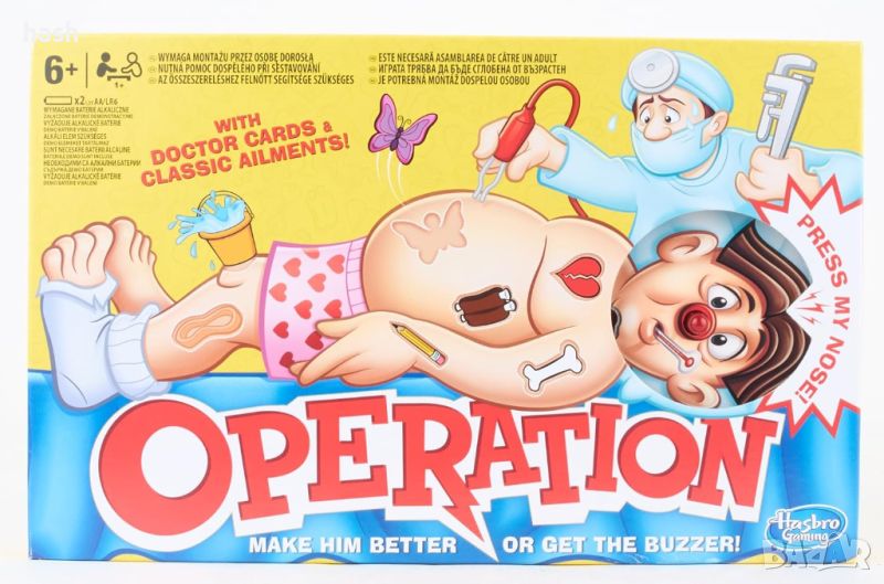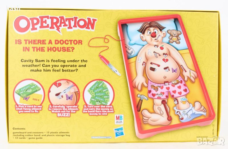 Hasbro Docteur Maboul Операция е забавна и увлекателна игра, която осигурява часове смях и забавление за цялото семейство. Амбициозните хирурзи ще харесат предизвикателството да премахнат внимателно различни заболявания от тялото на пациента като пеперуда в стомаха му или жаба в гърлото му, използвайки прецизността на пинсетите. Целта на играта е проста, но забавна: редувайте се, опитвайки се да извлечете заболяванията едно по едно, без да задействате звука „жужене“, което добавя елемент на напрежение и вълнение към играта. Изисква стабилна ръка и доза смях, докато играчите се аплодират взаимно, за да завърши операцията успешно. Подходящо за деца над 4-годишна възраст. Брой играчи: 1+. Работи на батерии: 2 x AA (Не са включени). Размери на опаковката: 40 x 25 x 4 см.