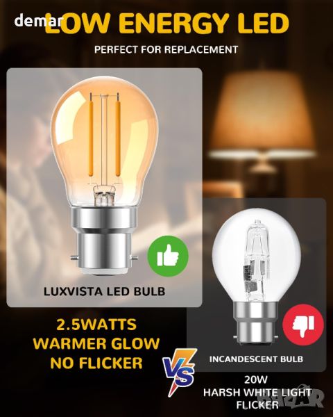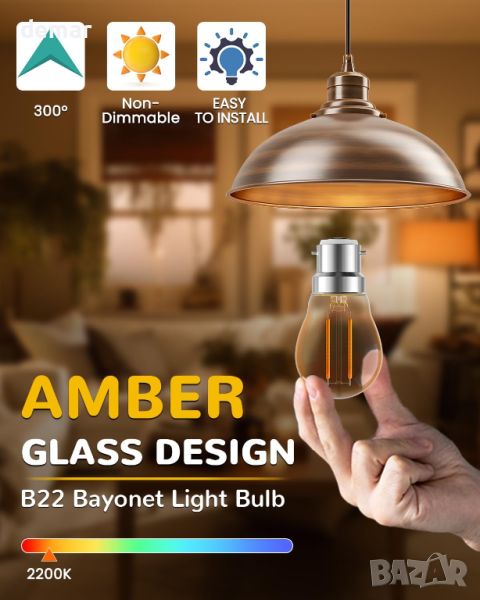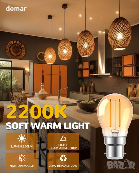 LED електрическата крушка TobeBright 2,5 W B22 се отличава с кехлибарен стъклен дизайн с форма на топка за голф с нажежаема жичка, излъчваща мека, жълтеникава светлина, която е лесна за очите и хвърля светлина във всички посоки. Тази енергийно ефективна крушка служи като алтернатива на 20W традиционни крушки и може да се похвали с дълъг живот. Идеална за създаване на уютна атмосфера в спалните със своята 2200K по-топла светлина, тази крушка не може да се димира и елиминира проблемите със съвместимостта с димерни превключватели. Широкото му приложение включва употреба в нощни лампи, полилеи и други закрити пространства, както и в търговски условия като кафенета и ресторанти, подобрявайки атмосферата и осигурявайки приветлива светлина.