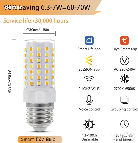 D dDraw Wi-Fi Smart E27 LED крушка, 7W 800LM, AC 230V, студено/топло бяло 2700K-6500K,димируема,2 бр