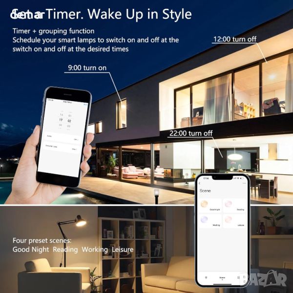 Тази AC 220-240V Smart Home E27 LED крушка предлага безстепенно затъмняване от 1% до 100% и регулируеми цветови температури между 2700K и 6500K. С обхват на осветеност от 670 LM до 800 LM, крушката може да се управлява дистанционно чрез приложения „Smart Life“ или „Tuya Smart“ през 2,4 GHz домашна wifi мрежа. Той поддържа гласови команди чрез Amazon Alexa или Google Home за лесно включване/изключване, затъмняване и настройка на сцената. Основните функции включват вграден таймер, възможности за планиране и предварително зададени сцени като Четене, Работа, Лека нощ и Релаксация. Забележка: Включва интелигентен контролен чип и не е съвместим с външни димери.