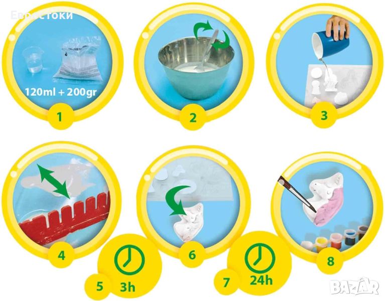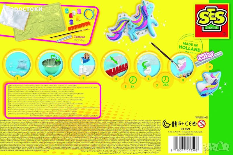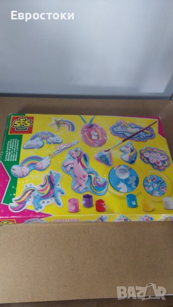 Вие също обичате ли еднорози? този комплект от SES creative ви позволява да издълбавате всякакви фигурки на еднорози, направени от гипс. Изсипете мазилката във формата и я оставете да стегне. Вземете предоставената боя и нарисувайте дванадесетте фигурки, както желаете. Забавно за правене и дава страхотен резултат!