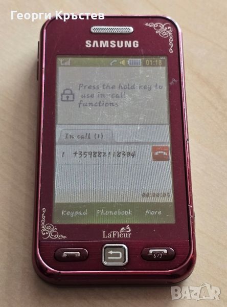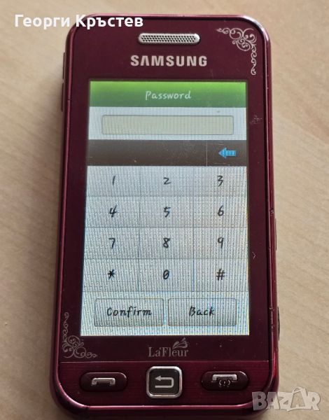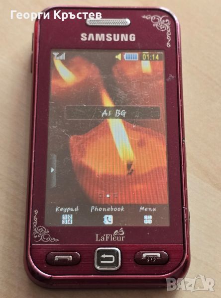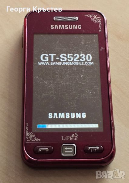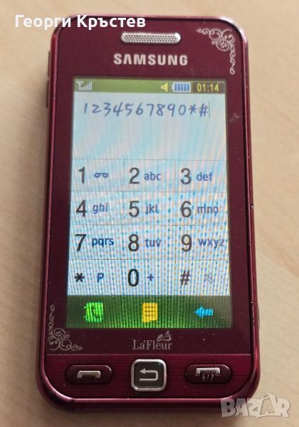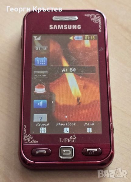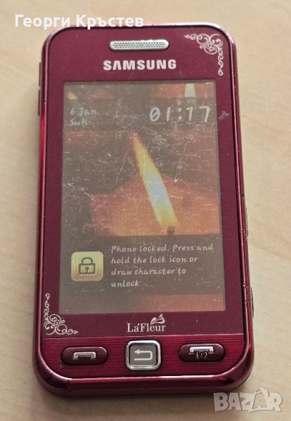 S5230 La Fleur - телефона се включва и работи, тестван с А1, нямам друга за проба, зарежда си батерията, която не е пробвана, но телефона се включва и работи с нея, но не мога да кажа в какво състояние е, няма БГ меню, слушалка, микрофон, тъчскрийн, камера, всичко е ОК, много добър външен вид, без зарядно, има една единствена забележка, има код на телефонния указател, съобщенията и файловете, който не знам.