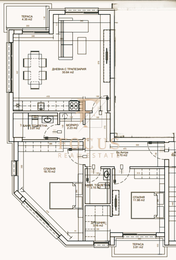 Разпределение: антре, просторна дневна с кухненски бокс, две спални, като едната разполага със собствена баня с тоалетна и дрешник, втора баня с тоалетна и две тераси.