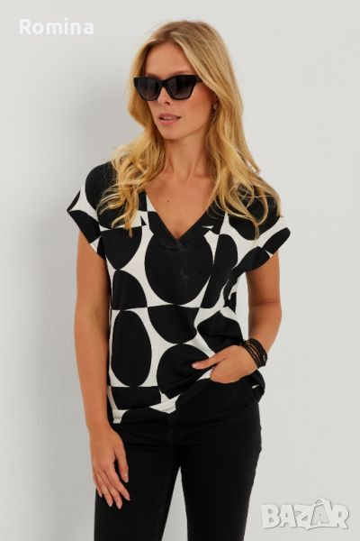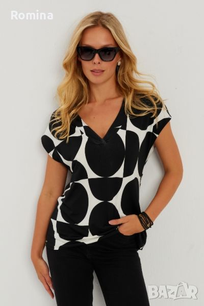 Дамска блузка с V-образно деколте в бяло и черно → Обява 45664151