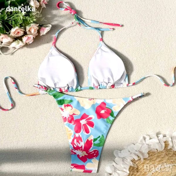 Бански за смели дами, горната част е с триъгълни чашки, с подплънки, с връзки на врата и гърба. Долнището е тип изрязана прашка с ниска талия и връзки. Еластична материя.