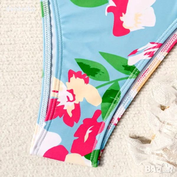 На брега на морето, на шезлонга или край басейна, ако искате да направите впечатление, то този моден бански костюм е точно за вас! Горнището е с подплънки, набрани в долната част за пълна свобода на бюста. Горната част на предложения секси бански костюм е с връзки, за по-добро регулиране на размера. Долнището е с високо изрязани отвори за краката и изрязана задна част тип бикина. Изработен е от висококачествен текстил, бързосъхнещ и устойчив, на избледняване. Изключително секси и стилно предложение за идващото лято!