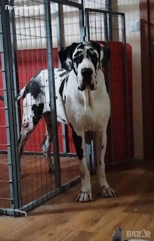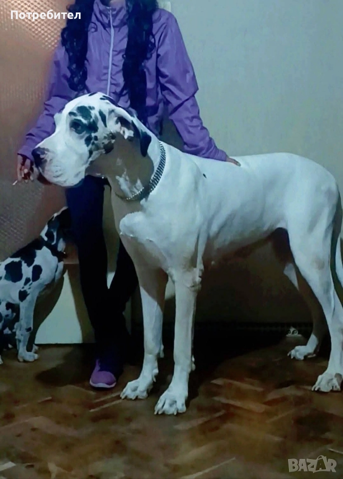 Немски дог женско и арлекин с 2 ваксини и чип. Кученцрто е от елитно потекло. Майката е висока 86 см. бащата е висок 1, 02 см.