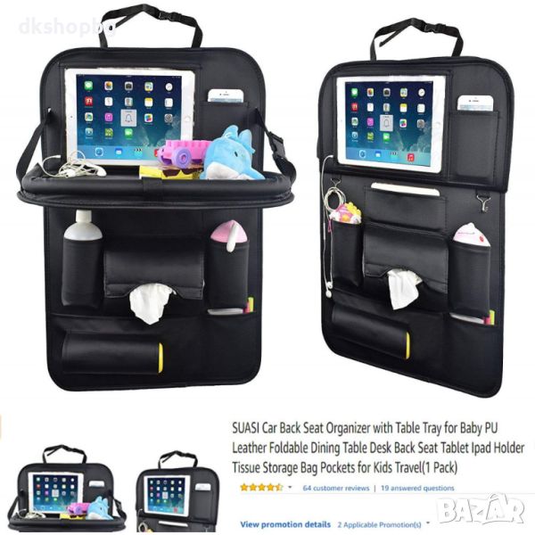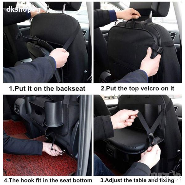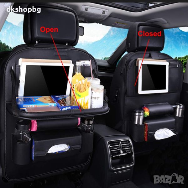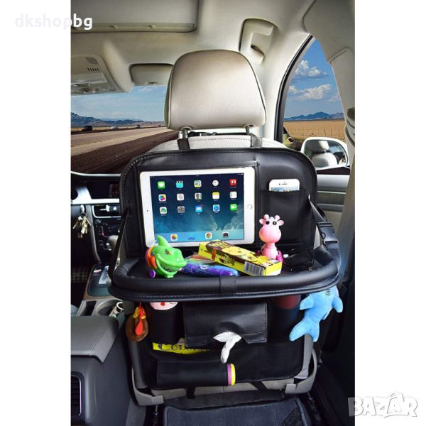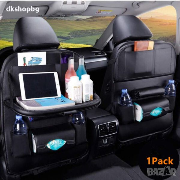 Монтира се на гърба на предната седалка и решава проблемите с разхвърляните дребни преднети по време на пътуване. Вече няма да ви се наложи да търсите химикалка за кръстословица или шишето с вода и дори по-големите придмети като кутията със салфетки. Практично решение е и джоба за чадър, поставен в долната част на органайзера.