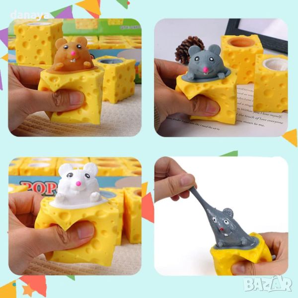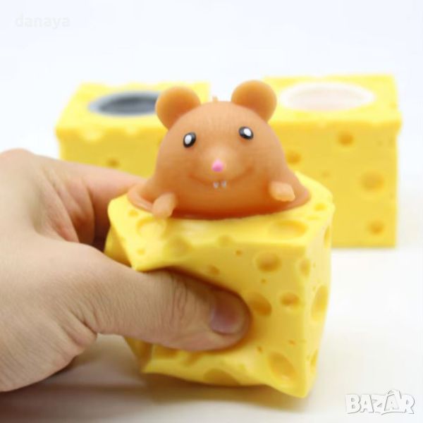 Забавна, креативна, декомпресираща играчка за стискане с форма на кубче сирене с мишка. Когато стиснеш сиренцето, мишката изкача. Идеален за забавен и незабравим подарък за малки и големи.