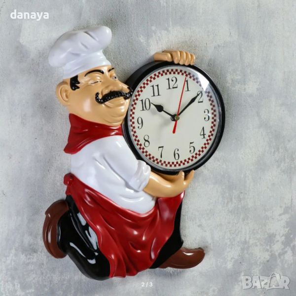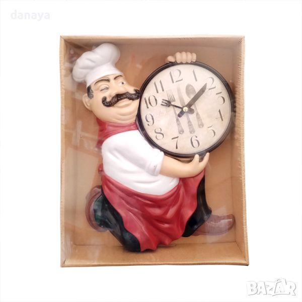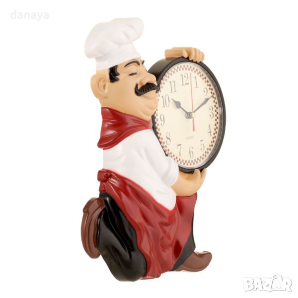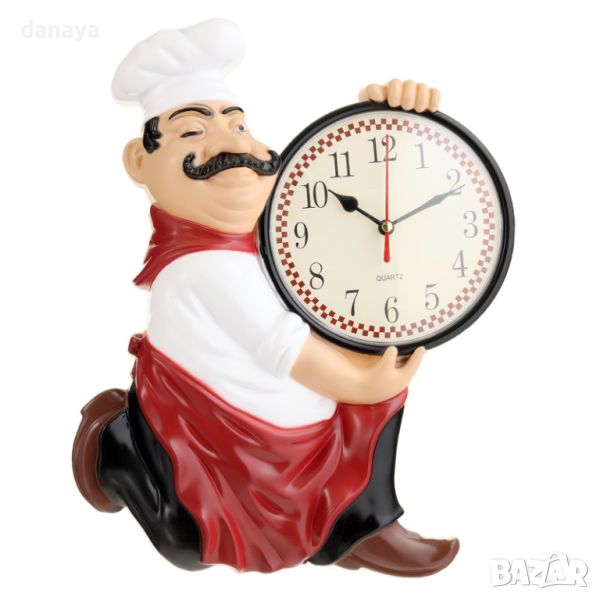 Стенен часовник за кухня Главен готвач. Креативен кухненски часовник с форма главен готвач, който държи голям часовник в ръцете си и стриктно наблюдава кой как върши своята работа. Интересен и различен дизайн, достоен за всяка кухня!