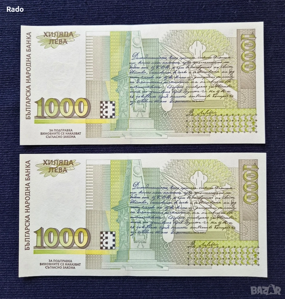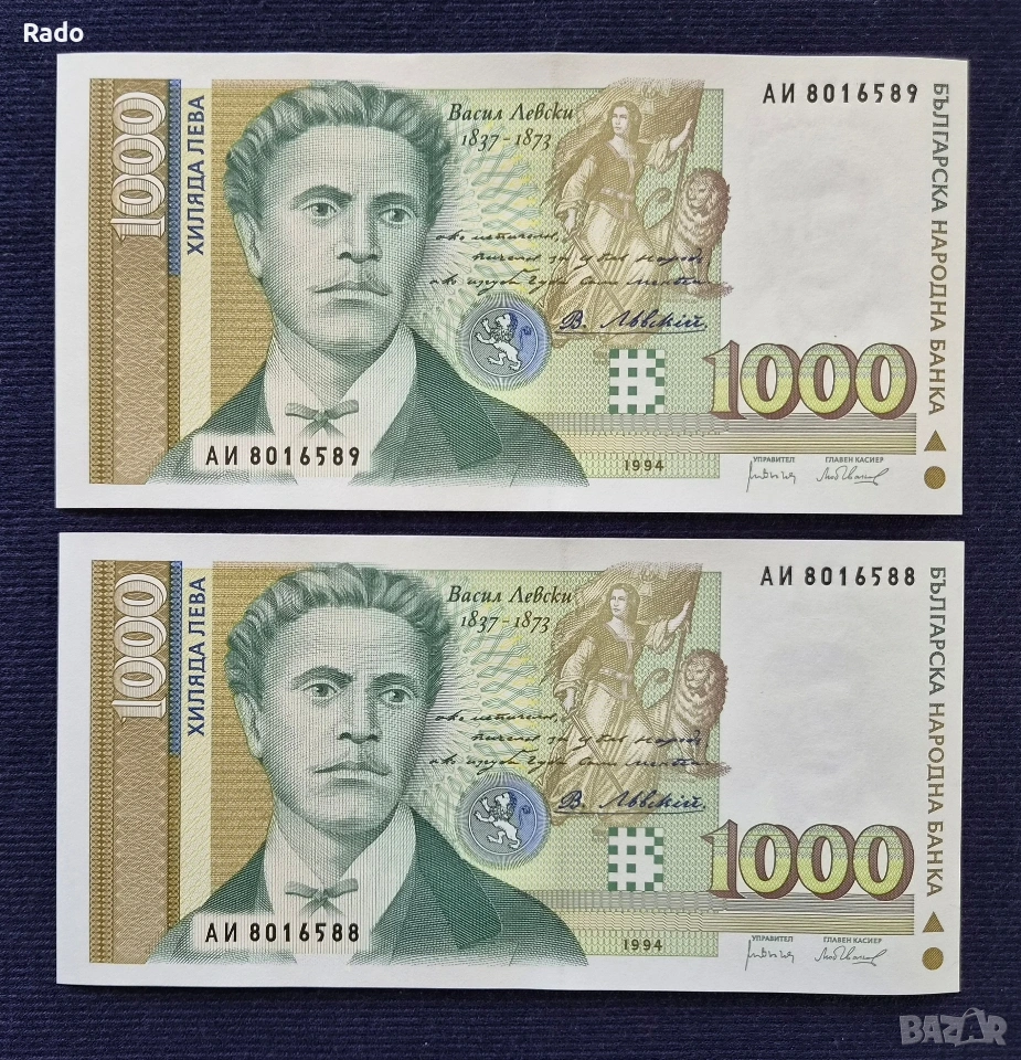 Непрегъвани Нови Банкноти( UNC) Васил Левски 1994г. Цена 10€ за два броя. Имам Налични бройки с поредни номера.Работя с Еконт с опция преглед.