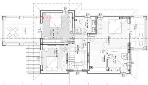 Етаж 2 Стълбище, коридор, родителска спалня със собствен санитарен възел, дрешник и тераса, втора спалня с баня и тоалетна, която е с излаз към тераса и трета спалня.