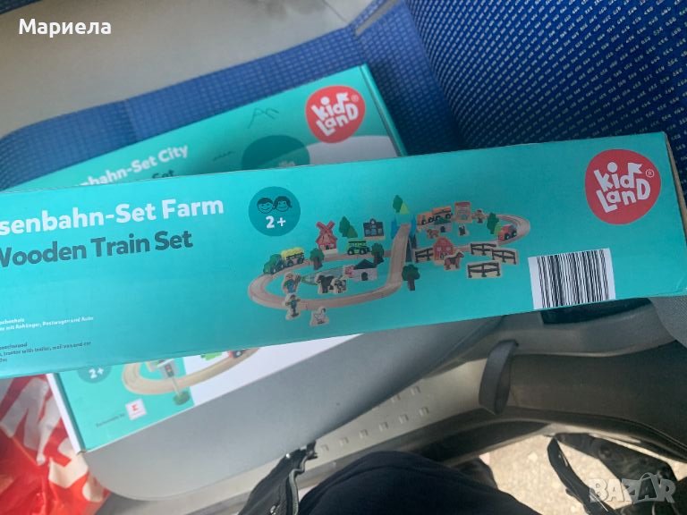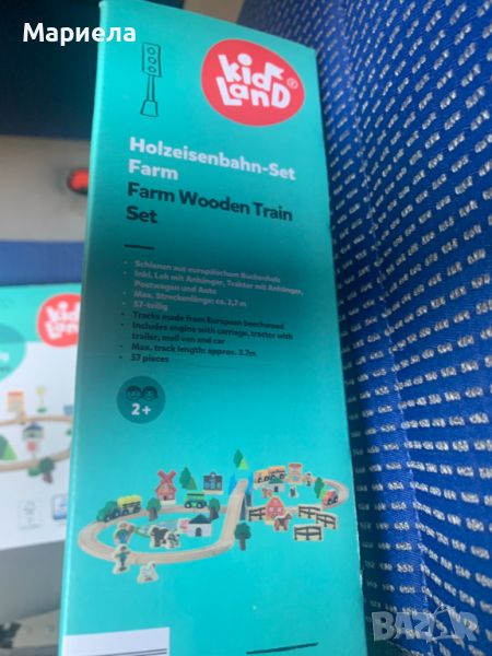 Влакчетата са закупени на разпродажба от Германия .Комплекта включва 57 дървени части .Нарича се "Дървен железница и ферма ".Съдържа релси от европейска букова дървесина.Развива креативността , фантазията и финната моторика на детето .Всички сгради , превозни средста , дървета и фигурки са изработени от висококачествена естествена дървесина .Включени са локомотив с ремарке , трактор с ремарке , пощенска кола и автомобил.Всички превозни средства и влакове са с магнитни съединители .Разнообразно оборудване с много креативни възможности за цглобяване.Съвместим със стандартни комплекти дървени релси и дървени пътища.Максимална дължина на отсечката - 2,7 метра .Подходящ е за деца над 2 годишна възраст .