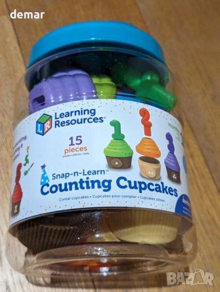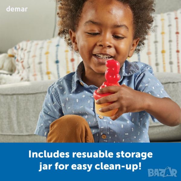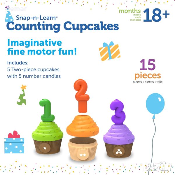 Комплектът "Pop-Open, Snap-Together Cupcakes" насърчава малките деца да развият силата на ръцете и фините двигателни умения с пет кексчета от 2 части. Той разполага с изскачащи свещи с числа за изучаване на числата 1-5, разпознаване на цветове и числа и умения за броене чрез съвпадение на цветовете на свещи и броене на звезди върху основите на кексчетата. Идеален за игра с въображение, комплектът се предлага с удобна вана за съхранение с дръжка за лесно почистване. Тази образователна играчка от Learning Resources, компания с 40-годишен опит, насърчава ученето чрез игра.