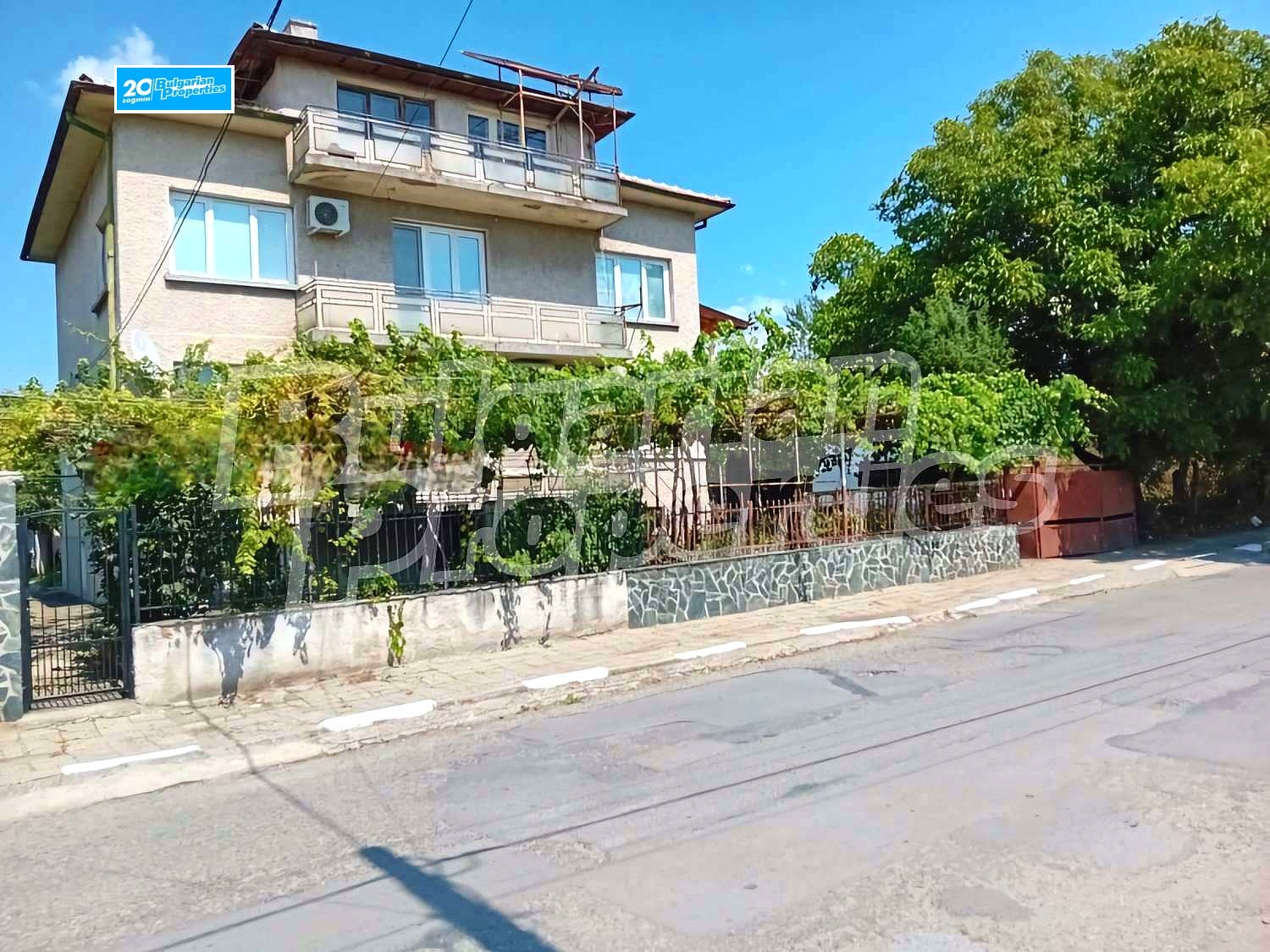 Ток, централен водопровод (с допълнителен резервоар с хидрофор ), канализация на къщата. На предния и задния двор, собствен водоизточник с шахта и помпа в задния двор, дублирано отопление с климатици и локално парно на дърва и въглища (със заредени 5 тона въглища и 3 куб. м. дърва). Дворът е зелен с плодни дървета и асми, сглобяем плувен басейн 25 куб. м. и 1.20 м. дълбочина (отопляем със слънчеви колектори), комбинирано отопление на бойлера в банята чрез слънчеви колектори, локално парно, ток и газ, самостоятелен вход с вътрешен открит и закрит паркинг, масивна електрифицирана железобетонна стопанска сграда в задния двор (две стаи, външна тоалетна и таванско помещение).