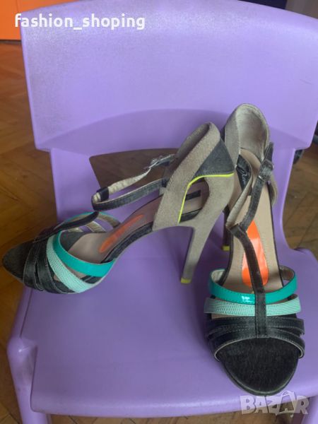 Стилни, елегантни сандали с оригинален дизайн и цветове, изработка от естествена кожа. Високият ток допринася за атрактивността и секси визията. Обувките са решени в оригинални цветове- цвят минт и зелено, черно и с акцент в неонов цвят. В подходяща комбинация дрехи, ще изглеждате неустоимо. Аз лично виждам такова уместно съчетание с едноцветна рокля в цвят минт.