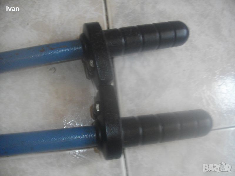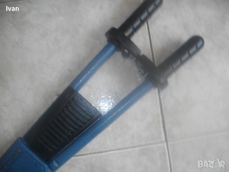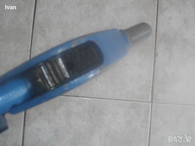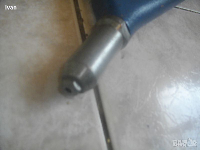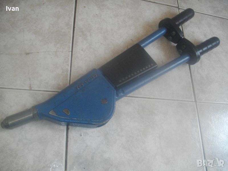 ОПИСАНИЕ на ръчна немска нитачка синя. Немска оригинална професионална/индустриална/промиишлена висок клас. Марка и модел GESIPA HN2 - Made in Germany.Алуминиева изцяло, масивна. Почти нова, с много запазен външен вид и отлично работно механиично състояие на тресчотъчния механизъм, корпус и дръжки. Дължина 57 см. Налични са всичките 5 бр. глави накрайници дюзи за поп-нитове, за размери поп-нитове от 3,0 мм до 6,4 мм. Тегло на нитачката - 2,0 кг.