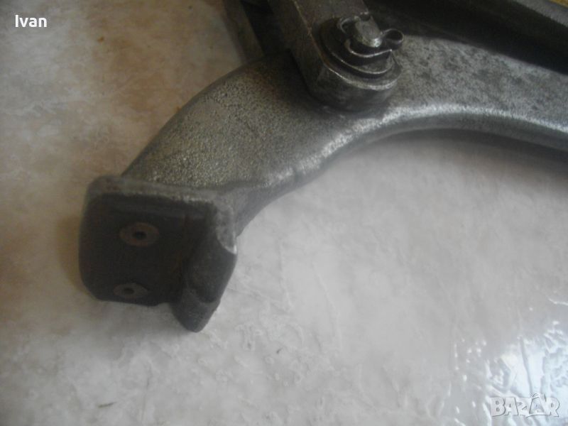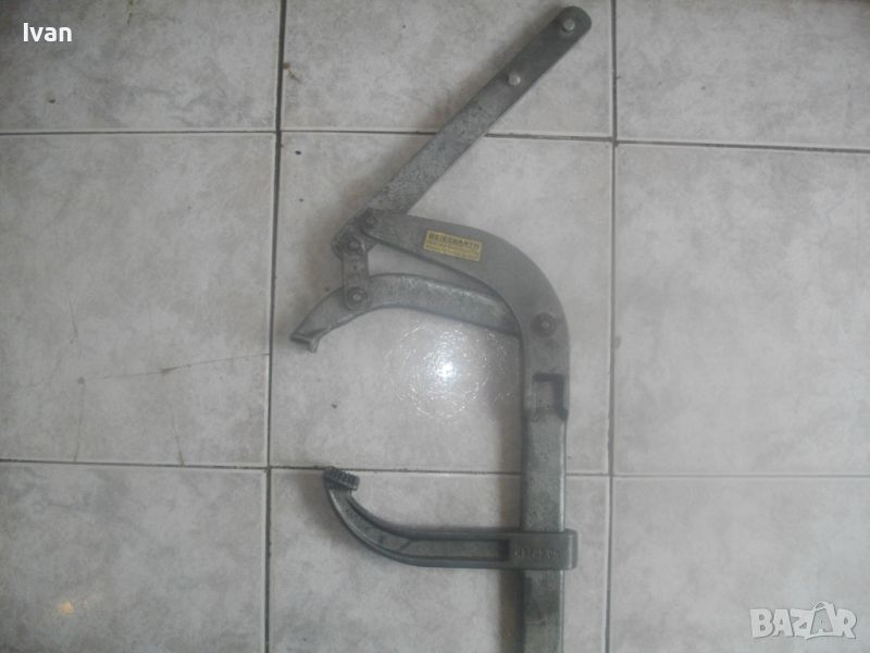 ОПИСАНИЕ на голяма скоба за клапани. Немска професионална/промишлена/индустриална. Старо масивно качество, от стария материал, Почти нова, много малко ползвана, в отлична работно механично състояние. Маркировки стикер за марка и поризводство - Beissbarth Fabrik f. mod. Werkstattausrustg. Munchen Mod. W5. Алуминева изцяло, масивна и плътна. Дължина със сгънато рамо - 40 см, с разгънато рамо - 68 см. Отваряне на запватните челюсти - до 200 мм. Разхвата е ргилируем 70-200 мм. Оребрена дона челюст. Дължина напред на скобата - 24 см. Тегло 4,5 кг.