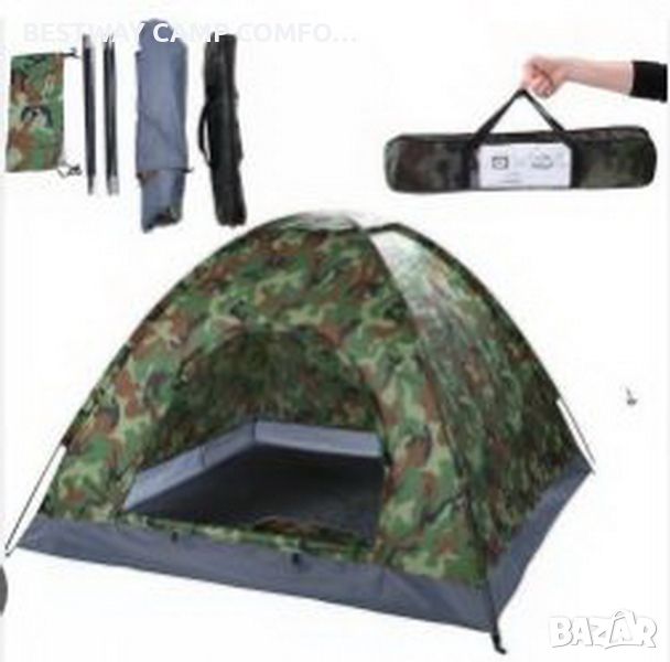 Изработена от непромокаем промазан плат, които не позволява на водата да прониква през него. Има комарник отпред и отгоре на палатката. Идва в пълен комплект от всичко необходимо за бързо и лесно сглобяване.