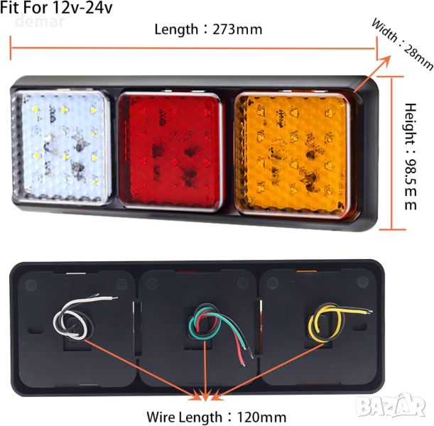 Тази двойка многофункционални LED задни светлини е с размери 273 mm x 98,5 mm x 28 mm и работи с 12-24 V захранване. Пакетът включва две задни светлини за ремарке, заедно с четири болта и гайки за монтаж. Всяка светлина има множество опции за окабеляване: черно за земя, червено за стоп светлини, зелено за задни/ходови светлини, жълто за мигачи и бяло за светлини за заден ход. Инсталацията е закрепена с два болта M5 и основата на лампата, която е трудна за премахване, след като щракне на място за стабилност, трябва да се сглоби преди да се прикрепи тялото на лампата. Светлините са изработени от висококачествени материали с подсилена прозрачна PC леща, която издържа на избледняване и има силна температурна устойчивост, докато основата от ABS е огнеустойчива и неплъзгаща се. Подходящ за широка гама превозни средства, включително тежкотоварни камиони, полуремаркета, товарни ремаркета, пикапи, ATV, трактори, лодки, автобуси и др.